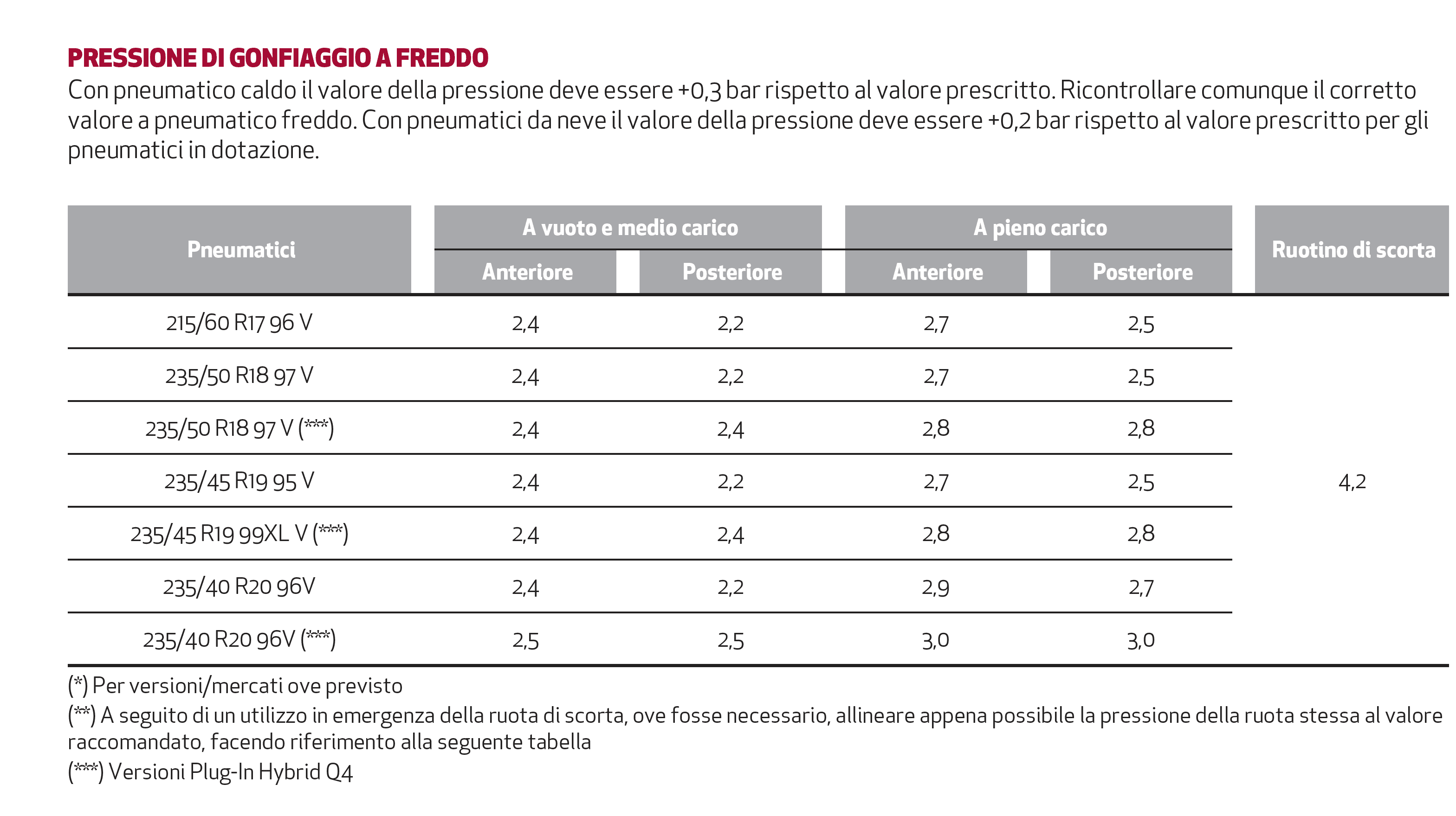 ...sempre in base alla mia ignoranza (mi scuso) contando che ho le gomme 4 stagioni 235/50 R18 101XL non ho chiara la questione del carico vuoto e medio / pieno per capire che valori far impostare .... 2,4 anteriore e 2,2 ?
