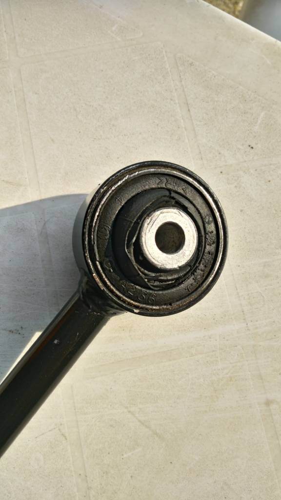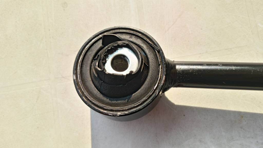 Ormai la gomma era sempre più deteriorata e ieri ha tirato il colpo di grazia, mi è rimasta in mano la boccola centrale dove passa la vite, separandosi dal resto del silent block.