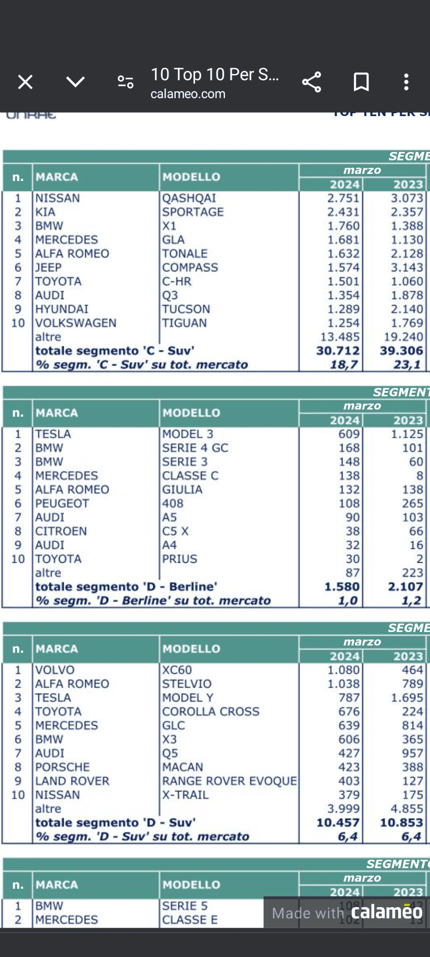 Peraltro , per il nostro amico MC production possiamo notare che anche Giulia è al quinto posto come Tonale, solo che è uscita 8 anni fa ormai senza motori nuovi senza novità e vende solo per le qualità dell'auto e della guida (ribadisco che Giulia è solo berlina mentre le concorrenti sommano anche le wagon) quindi si può dire che Giulia è la Berlina 4 porte di segmento D più venduta in Italia dopo Tesla e serie 4 che non prevedono wagon ... praticamente è al Terzo posto ....più di Tonale che è al quinto ( o MC production vuole contestare anche questi dati e darci una sua interpretazione)