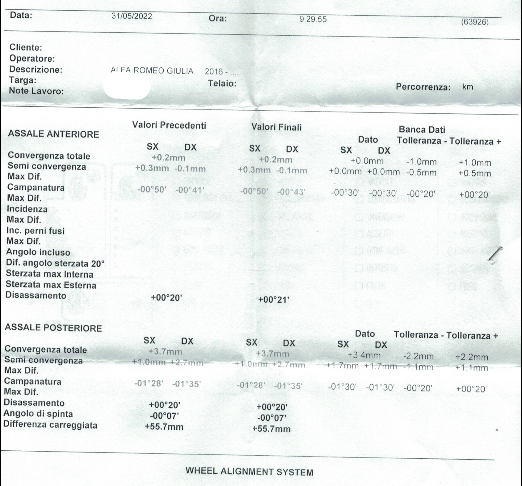 non capisco....i "valori precedenti" in effetti erano da correggere (sia la convergenza anteriore che quella posteriore, mentre il camber posteriore era ok) ma non vedo differenza alcuna nei "valori finali".....forse la stampa è parziale e manca il "dopo"?
